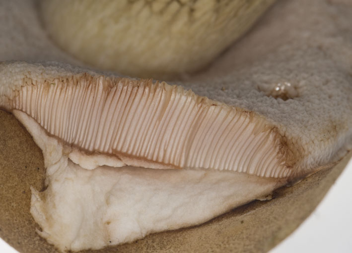 Der Pilz hat sein weißes Röhrenfutter beibehalten. Alles drücken und rumfummeln konnte daran nichts ändern. Lediglich mit dem Makroobjektiv sieht man vereinzelt wie stellenweise etwas Färbung ins rosa oder braun beginnt. 2 Stunden nach dem Fotoshooting kommt ganz allmählich auch ein zaghaftes Bräunen.