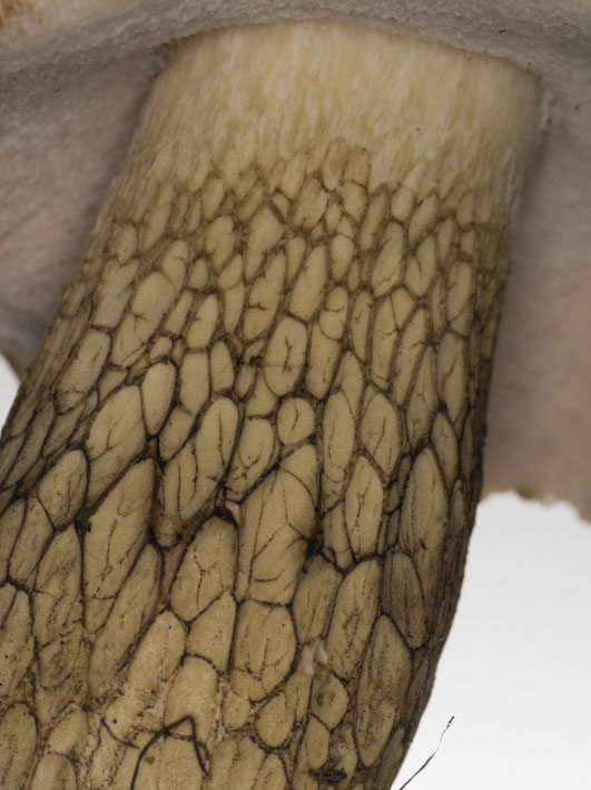 Stiel: bis 12 cm lang; bauchig bis keulig, vor allem im Alter auch zylindrisch; Grundfarbe bräunlich, olivbraun, weißlich; darüber mit deutlicher, erhabener Netzzeichnung; die oft den Stiel von der Spitze bis zur Basis komplett bedeckt; Netz beige bis bräunlich, auch mit Olivtönen; Basismycel weißlich