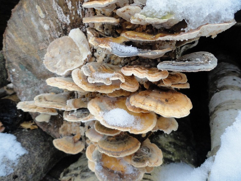an einem Holzstapel dann die Schmetterlings - Tramete ( Trametes versicolor , letztes Bild )