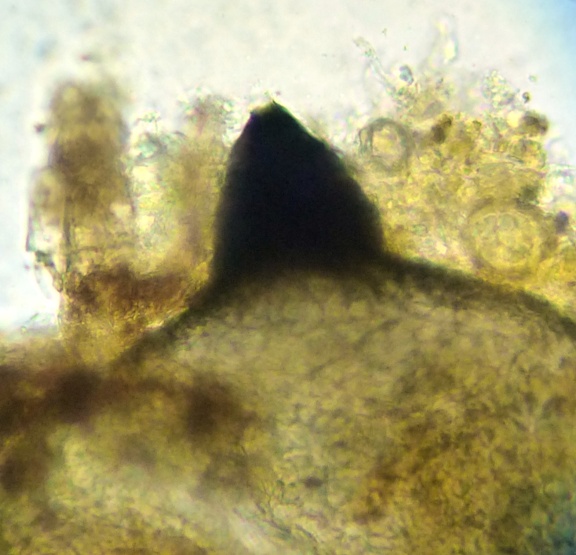 Schnell übersehen, weil nur die winzigen, schwarzen Perithecienmündungen aus dem Substrat ragen.