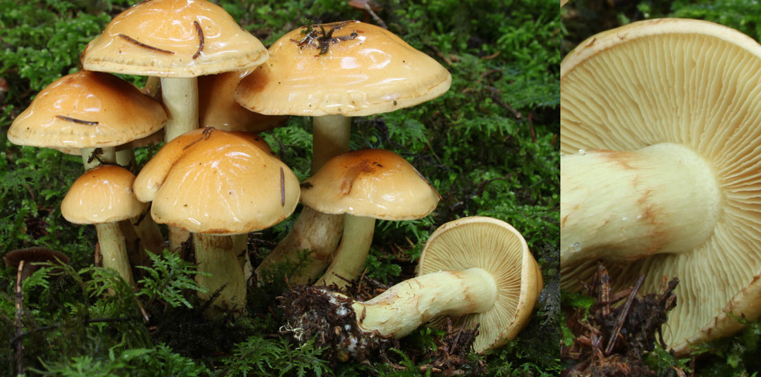 Auffälligkeiten: Gesägte Lamellen, schleimige Hutoberseite und Rest eines braunen spinnwebenartigen Ringes am Stiel.