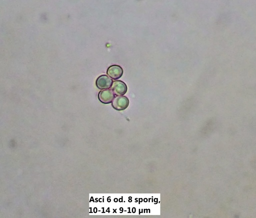 Die Asci sind kaum zu sehen, so fein sind die. Sie enthalten 6 oder 8 Sporen. Die Sporen haben einen winzigen, apikalen Keimporus und ein oder zwei Öltropfen. Haare finde ich nicht, bzw, nur Fragmente die aber auch von Hyphen stammen können.