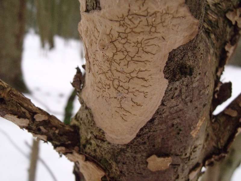 Zur Zeit Findet man häufig diesen Rindenpilz. Der ist wunderschön mit diesen Trockenrissen überzogen. Nur, welcher Rindenpilz ist das? Der Fleischrote Zystidenrindenpilz (Peniophora incarnata) etwa??? Aber fleischrot ist er nicht, oder nur vom Frost ausgeblichen?