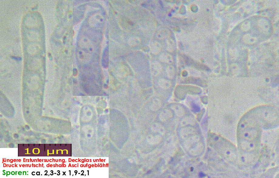 Sind so ungefähr die kleinsten Sporen bei Bechern, die ich kenne. Da kommt natürlich ein "Normal-Mikroskop" auch an seine Grenzen.