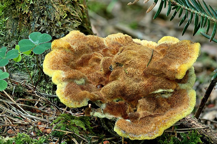 Rein farblich betrachtet kann der Kiefern-Braunporling äußerlich wirklich quietschig knallgelb sein, das Vorhandensein von Orange-Rot-Tönen hingegen findet sich meiner Meinung nach aber nur bei Fenchel-Porlingen.