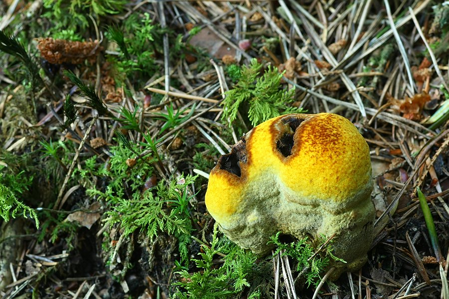 Rein farblich betrachtet kann der Kiefern-Braunporling äußerlich wirklich quietschig knallgelb sein, das Vorhandensein von Orange-Rot-Tönen hingegen findet sich meiner Meinung nach aber nur bei Fenchel-Porlingen.