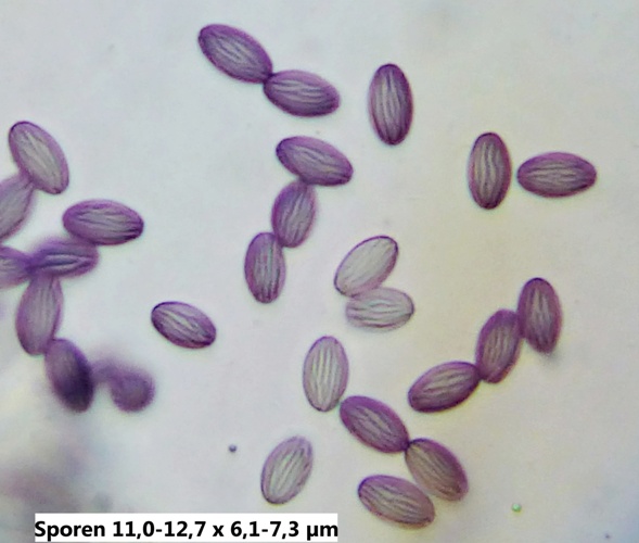 Typisch die kleiige Außenseite und die Paraphysenspitzen. Zwei meiner Funde hatten übrigens ähnlich kleine Sporen: 10,5-12 x 6-7 bzw. 11,5-13 x 6,5-7.