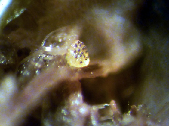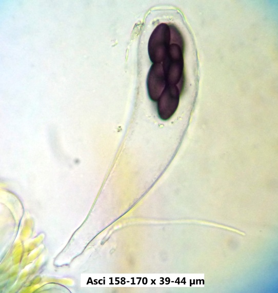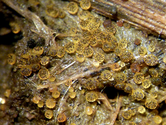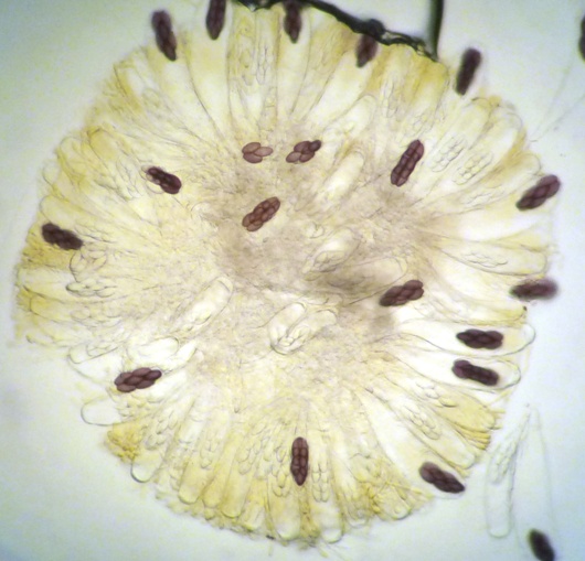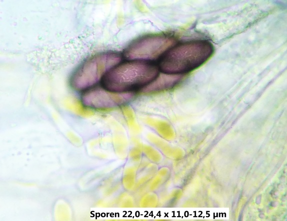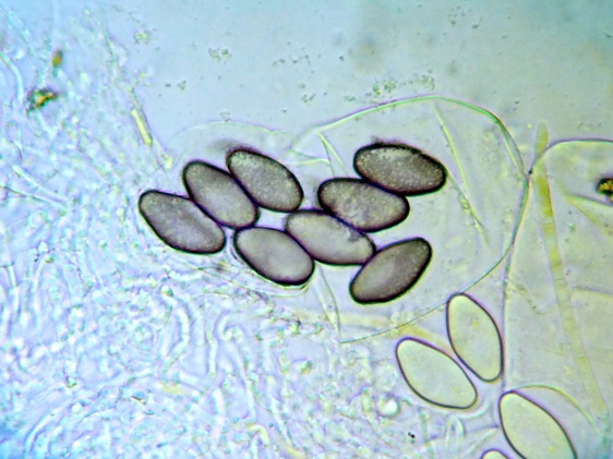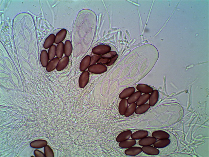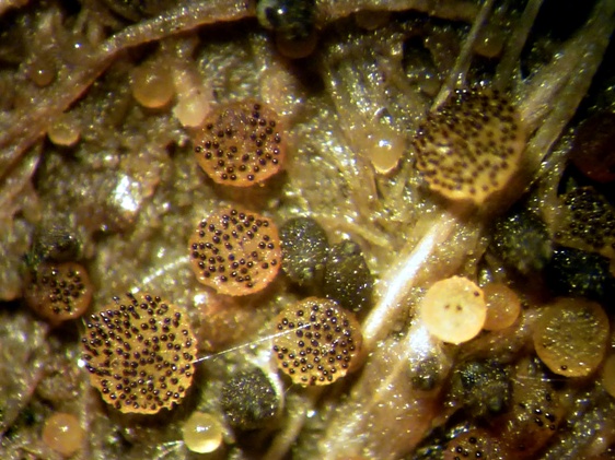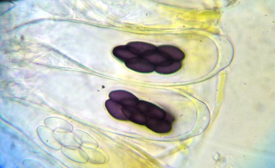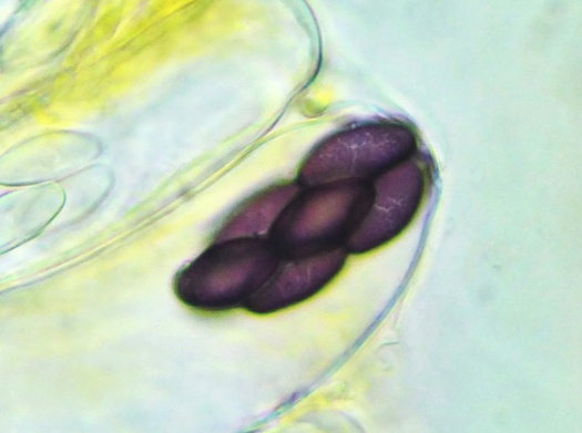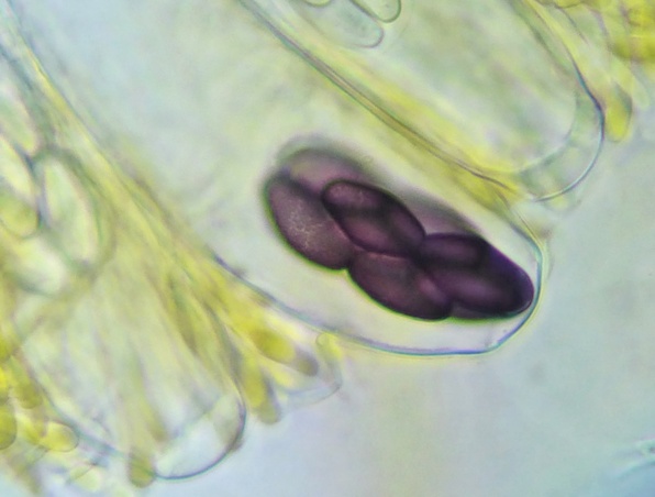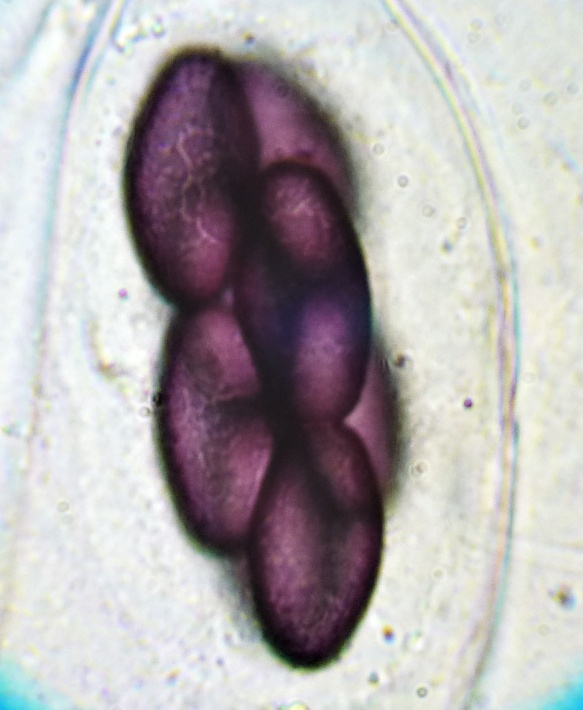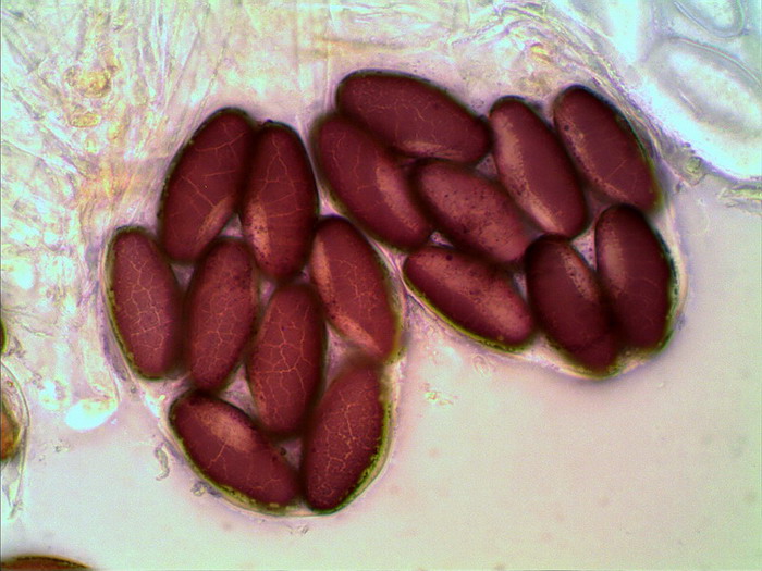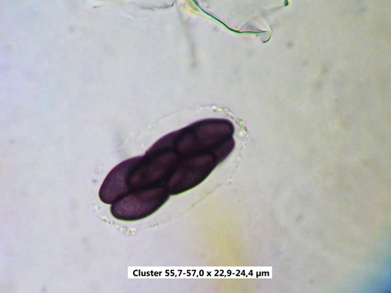 Die Sporen sind jung lose, im Alter fest aneinander heftend. Das Epispor löst sich leicht ab und zeigt bei reifen Sporen (purpurviolett) deutliche Risse. Das Ornament ist nicht warzig, sondern fein granuliert. Die Cluster sind von einer Gelhülle umgeben.