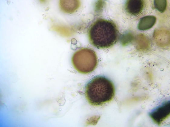 Die Fuchslosung, die ich grade untersuche ist durch und durch mit Sporen von Elaphomyces muricatus (Stachelige Hirschtrüffel) durchsetzt.