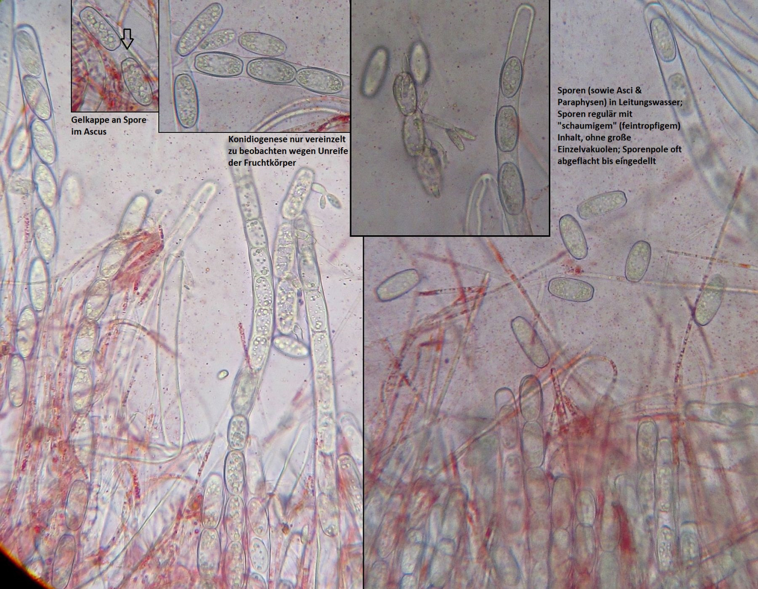 In frischmaterial zeigen sich da feine, kleine Tropfen, die sich zu den Sporenpolen orientieren (siehe Svens Bilder). bei Totmaterial fließen die kleinen Tröpfchen zusammen und bilden größere, das kann dann unter Umständen ählnich aussehen wie bei Sarcoscypha jurana (Linden - Kelchbecherling). Dort sind aber bei Frischmaterial regelmäßig zwei große Tropfen an den Sporenpolen zu finden.