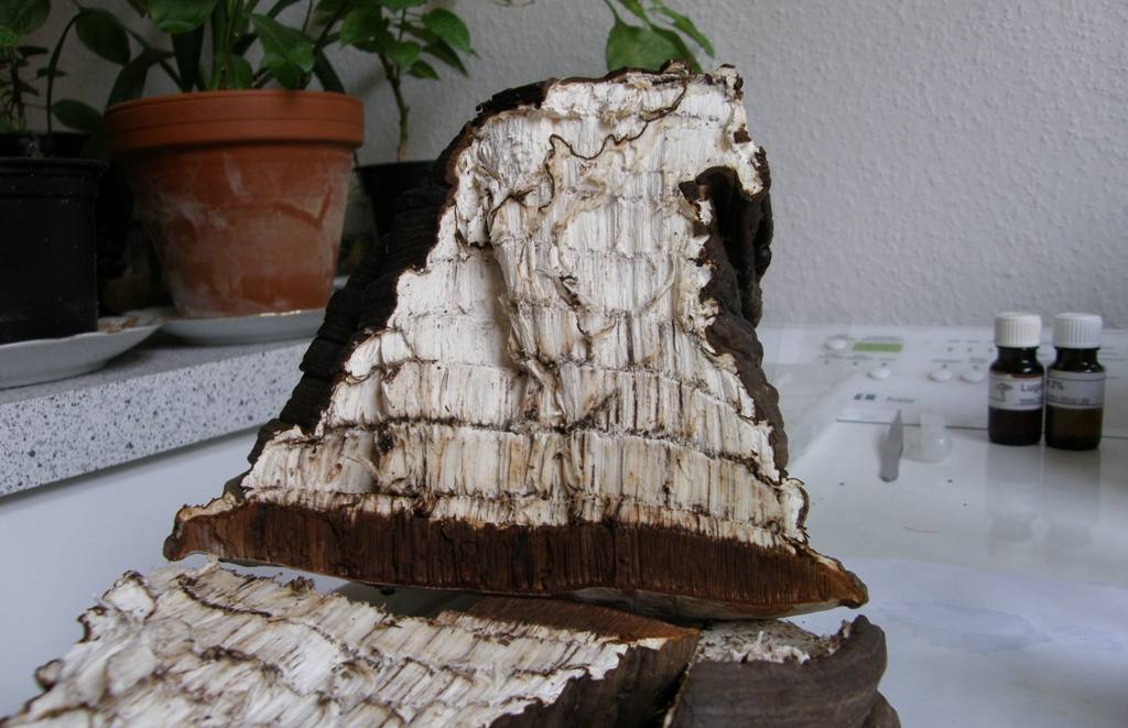 Im Schnitt erkennt man bei älteren Exemplaren oft mehrere Röhrenschichten, die jeweils bis max. 2 cm dick sind und durch dünne, dunkelbraune Schichten von Fruchtfleisch voneinander abgegrenzt sind; bei besonders alten fruchtkörpern mit vielen übereinanderliegenden Röhrenschichten fehlt das Hutfleisch bisweilen völlig, dafür sind die alten Porenschichten stark von weißlichem Mycel durchzogen.