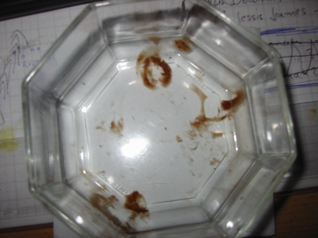 weis den nun jemand noch was zu den sporen? die sporen der pilze die ich gesammelt hab waren rostbraun in der glas schüßel in welcher ich die pilze hatte sah es am nächsten tag etwa wie etwas verschmierte geschmolzene milchschockolade aus(siehe bild)! die sporen der gifthäublinge sollen ja auch braun sein (hellbraun) leider hab ich kein bild gefunden um einmal vergleichen zu können! -