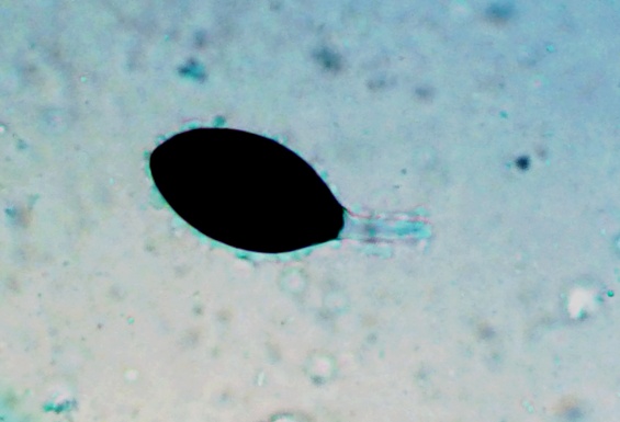 Nach Anfärben mit Tusche sieht man teilweise die etwas "verrutschte" die Sporen umgebende dünne Gelhülle.