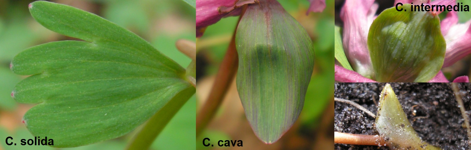 Der Mittlere Lerchensporn (Corydalis intermedia) kommt zerstreut vor, er wird meist gar nicht erkannt. Er blüht etwas früher als seine Verwandten und ist kleiner und zierlicher. Er hat wie der Hohle Lerchensporn ganzrandige Hochblätter, hat aber wenn man ein bisschen Erde zur Seite buddelt ein bleiches Niederblatt an der Basis des Stängels. Er hat auch weniger Blüten.