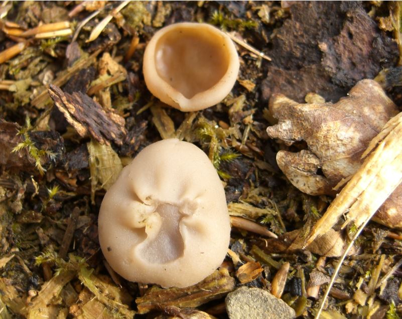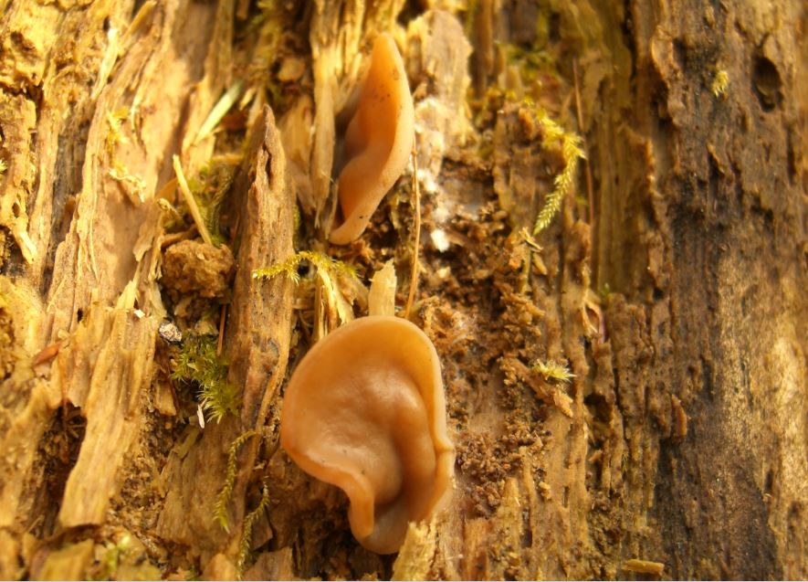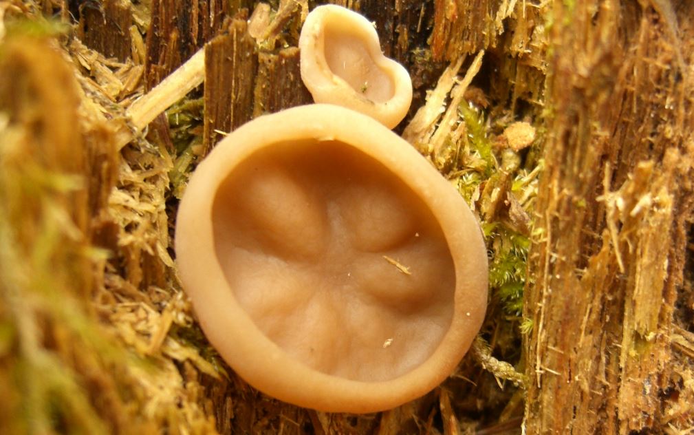typisch becherlingsartig, die vertikal aus dem Substrat wachsenden Fruchtkörper sind jedoch auch interessant, siehe Fotos.