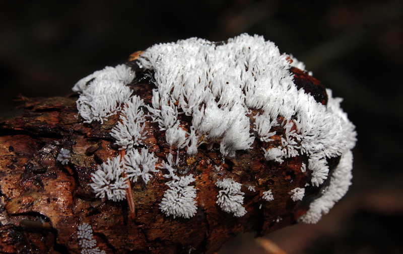 Ich habe vorige Woche in einen Fichten Wald Pilze gefunden die von weiten wie weißer Schimmel aus sahen auf Baumstümpfen und Tannenzapfen. Aus der Nähe betrachtet erinnerten sie eher an sternartigen Korallen.