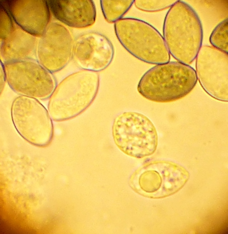 Die Sporen die im unreifen zustand eine De Barry Bubbel zu haben scheinen verfärben sich bei zunehmender Reife bläulich und haben eine Größe von 15x7,5 µm.