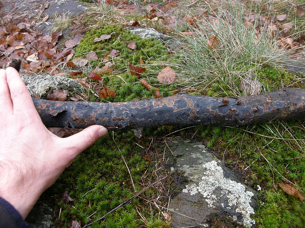 Eine komisch graue Kollektion habe ich noch zu zeigen, aus dem Frühjahr 2016 und wieder aus Oberitalien, an liegendem, berindetem Laubholzast, Bergtal auf ca. 650m üNN, Laubmischwald (vor allem Esskastanien, Eichen, Birken, Hasel, Eberesche) auf saurem Granitboden: