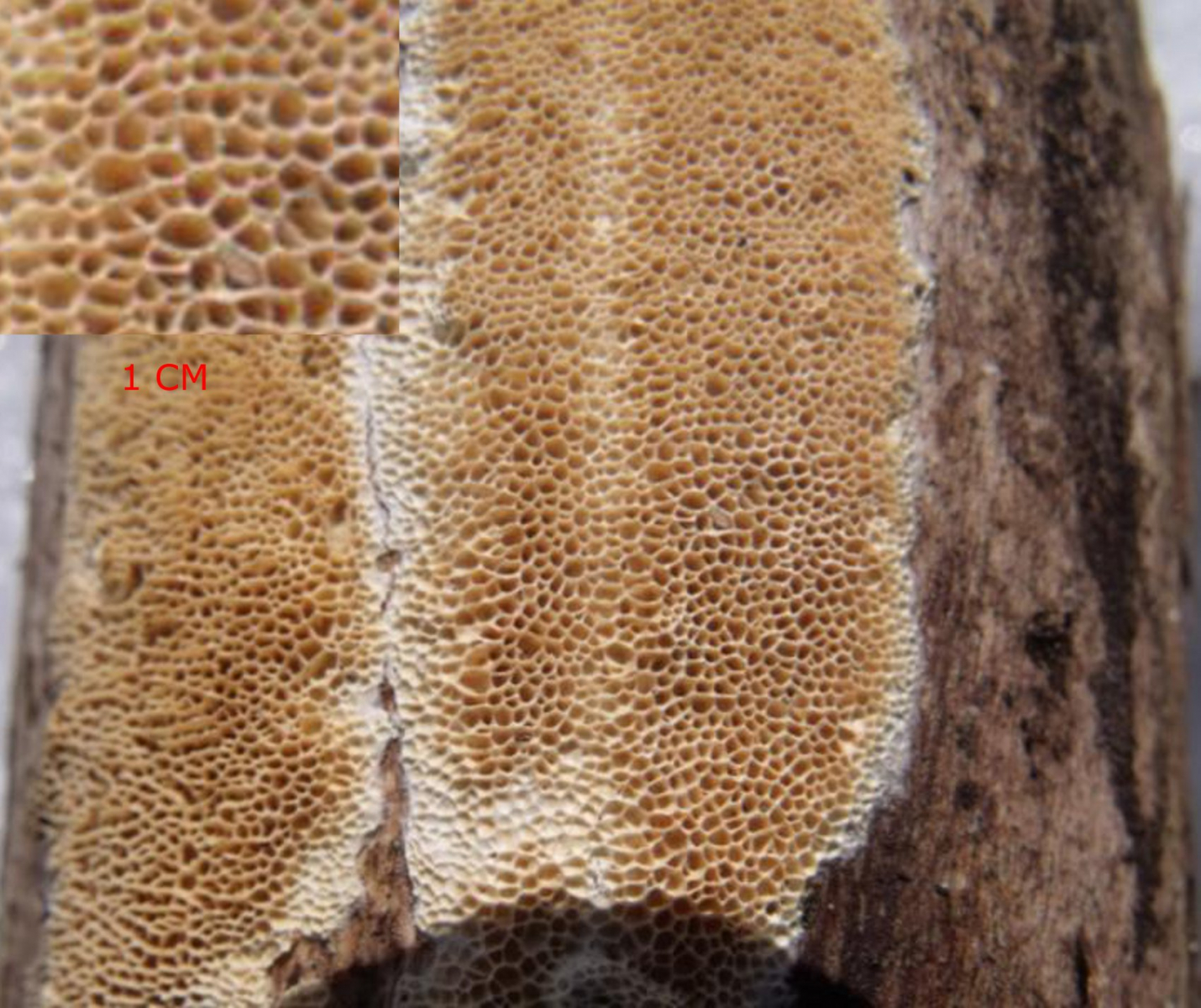 Ja, das stimmt mit der Porengröße. Bei 5-6 Poren auf dem Millimeter dürfte man die ohne Lupe kaum erkennen. Die konnte man aber erkennen. Sind wohl mindestens doppelt so groß. Aber Junghuhnia sollte wohl richtig sein?