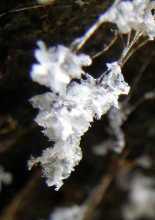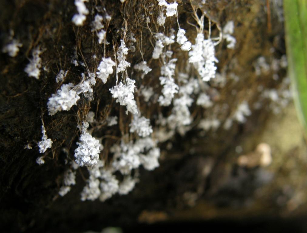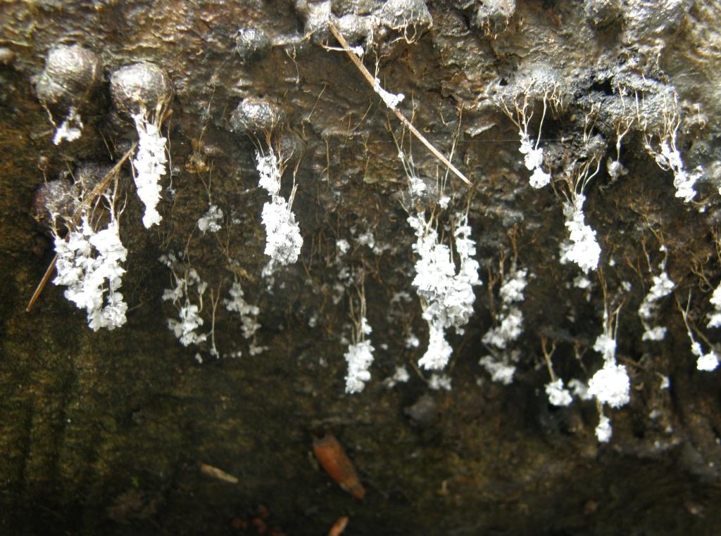 Die Fruchtkörper hängen an der Unterseite eines bemoosten Buchenstammes in einem vergessenen Holzstapel. Auffällig ist, daß sie größtenteils an den Fruchtkörpern von Hypoxylon cf fragiforme (rötliche Kohlenbeere) sitzen.