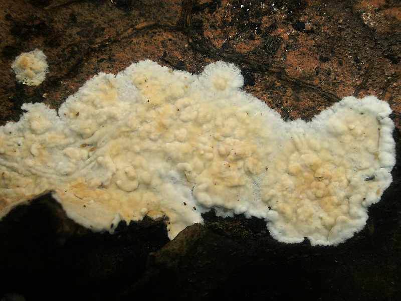 Zwar stelle ich rein optisch schon Ähnlichkeiten zum Ablösenden Rindenpilz (Cylindrobasidium evolvens/laeve) fest, aber dadurch, dass schon Stücke der Borke am Substrat fehlen, ließen mich da sehr unsicher werden.