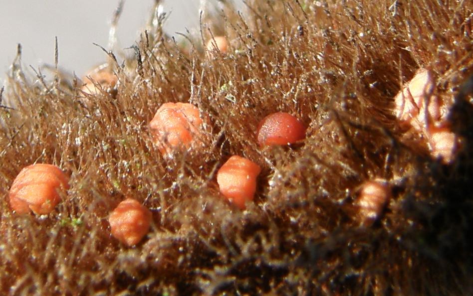 Völlig vertrocknet, aber immer noch schön ziegelrot: Die Zinnober-Tramete, Pycnoporus cinnabarinus