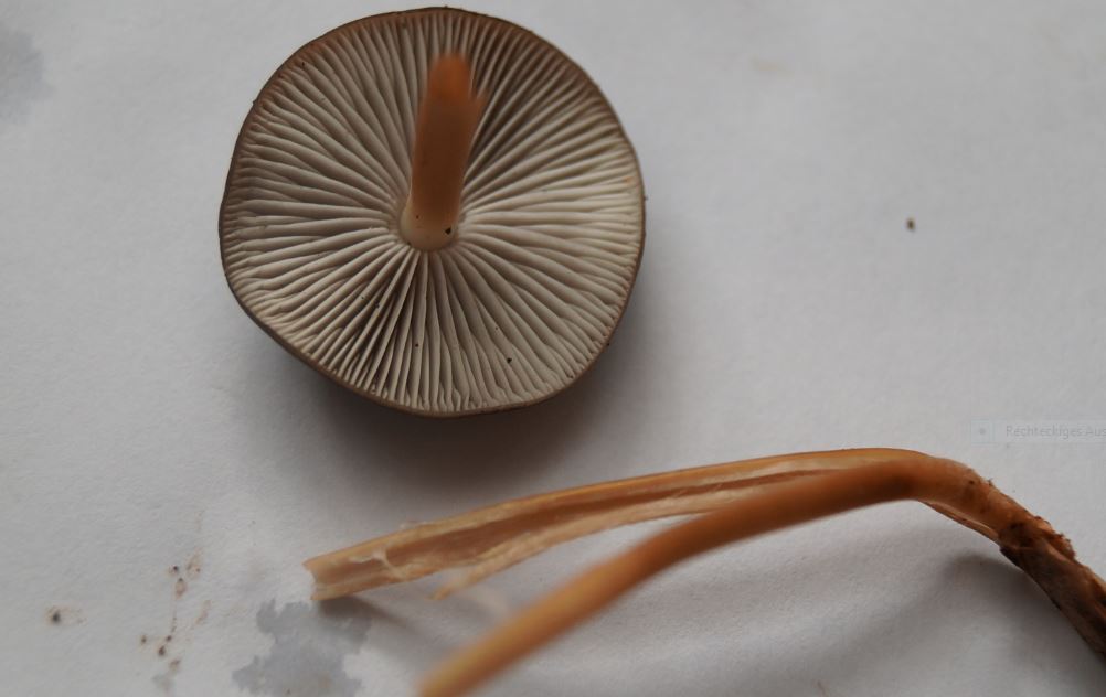 Zum Hutrand hin Lamelletten, die Lamellen sind glatt, vom Hut nicht leicht trennbar, cremefarbig Richtung hellbraun. Ich würde den Burggraben bejahen, ausgebuchtet angewachsen.