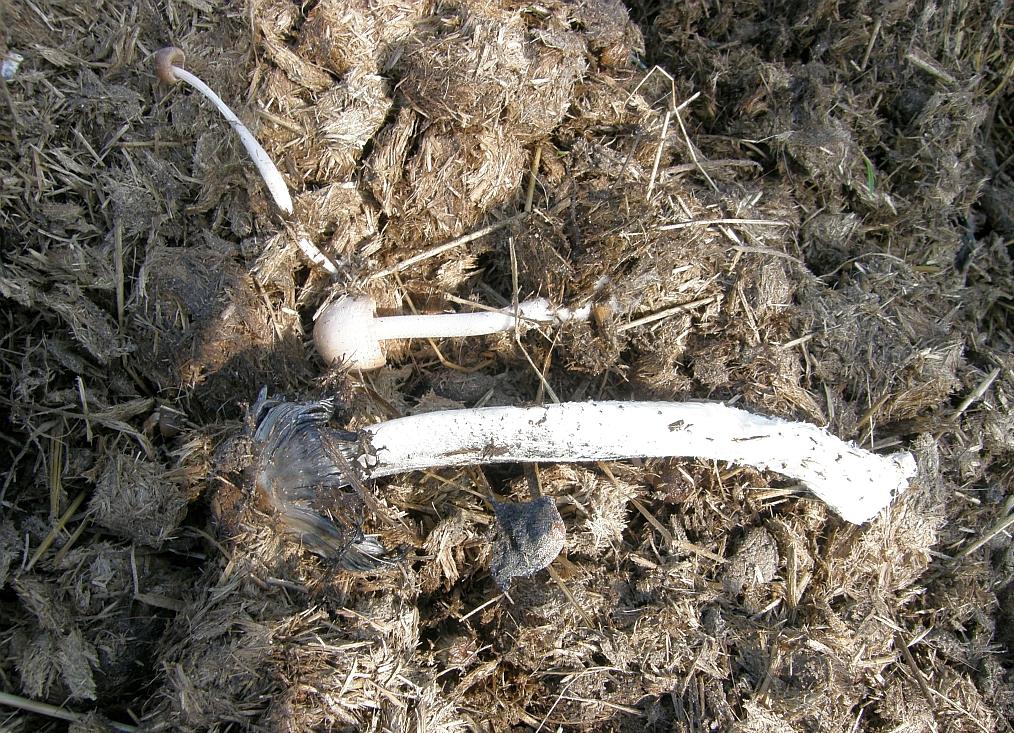 Darauf leuchtete uns schon von Ferne eine Gruppe recht großer, weißer Pilze an. Nachträglich geschätzt waren die größten Exemplare schon gut 10 cm hoch. Die Lamellen waren größtenteils noch weißlich, allerdings fanden sich auch zwei alte Exemplare in der Gruppe, eines mit typisch tintlingsartig schwarz zerlaufenden Lamellen und eines so im Zwischenstadium.