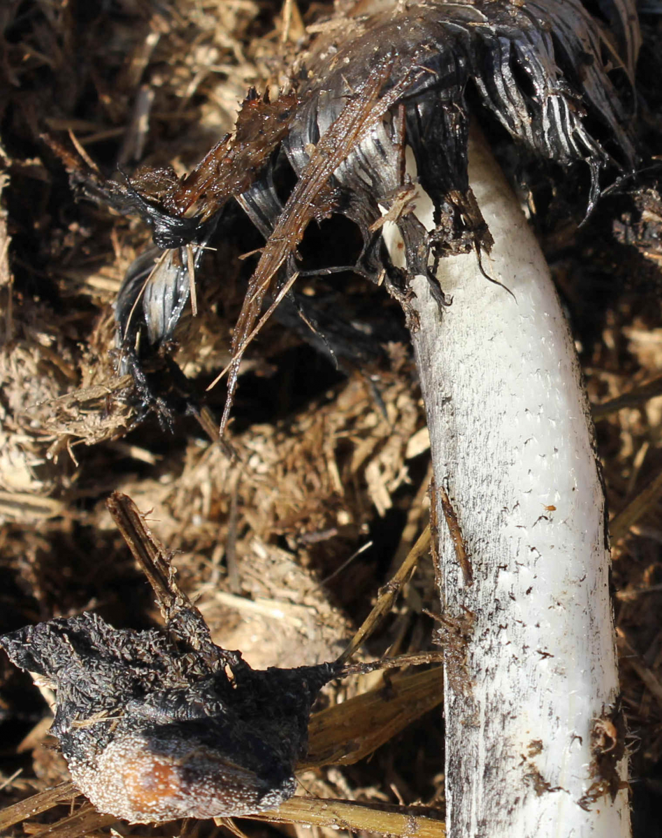 Darauf leuchtete uns schon von Ferne eine Gruppe recht großer, weißer Pilze an. Nachträglich geschätzt waren die größten Exemplare schon gut 10 cm hoch. Die Lamellen waren größtenteils noch weißlich, allerdings fanden sich auch zwei alte Exemplare in der Gruppe, eines mit typisch tintlingsartig schwarz zerlaufenden Lamellen und eines so im Zwischenstadium.