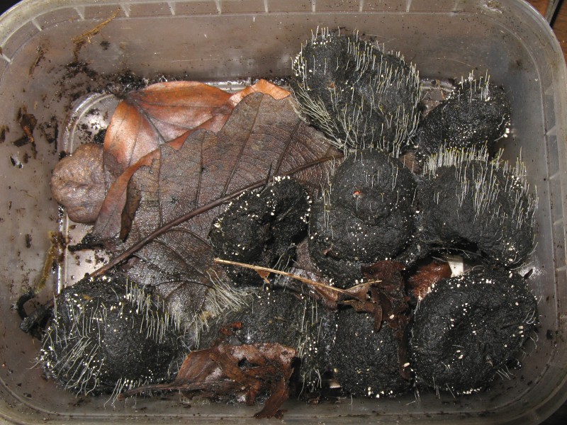 Zwar sind meine Dosen wohltemperiert, dennoch froren die Einzelteile der Wildschweinhinterlassenschaft wohl ein bisschen. Nach einer Woche wuchs ihnen ein Fell: