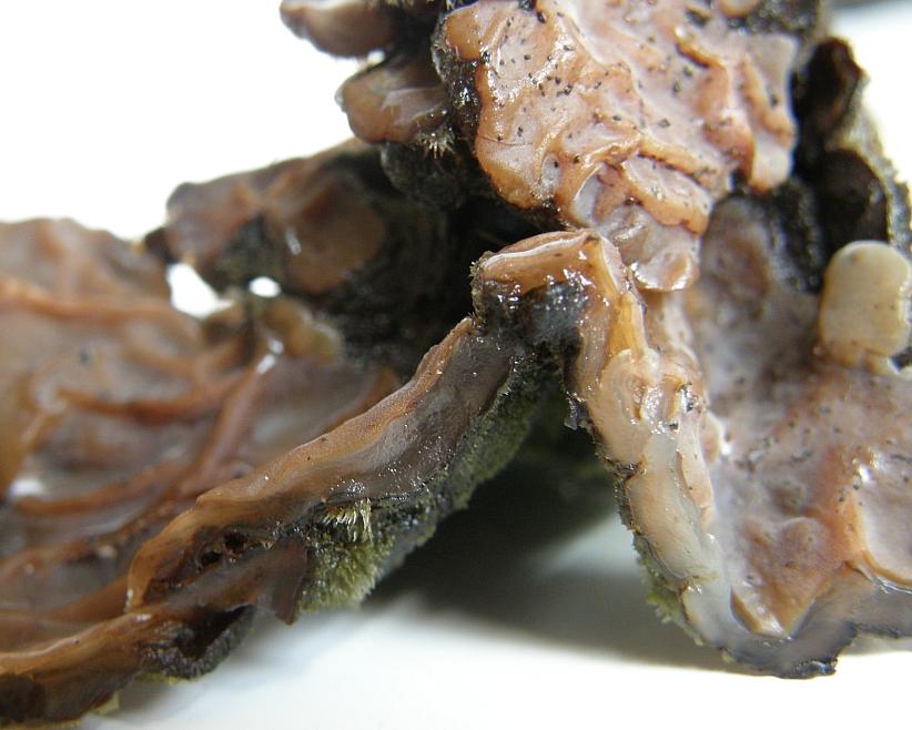 Fleisch: in nassem Zustand gallertig bis (weich-)knorpelig, bräunlich bis durchsichtig, elastisch; trocken sehr hart und zerbrechbar; sowie wesentlich dünner als bei Nässe, daher auch dunkler und kaum hyalin; ohne besonderen Geruch oder Geschmack