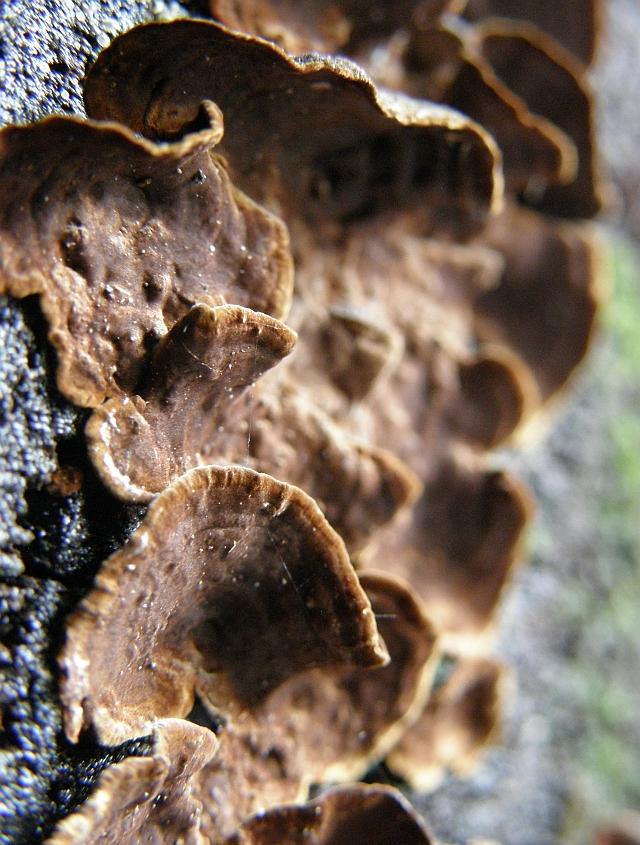 Hier wächst Pseudochaete tabacina mal an dickerem Holz, da macht sie auch "ordentliche" Hütchen.