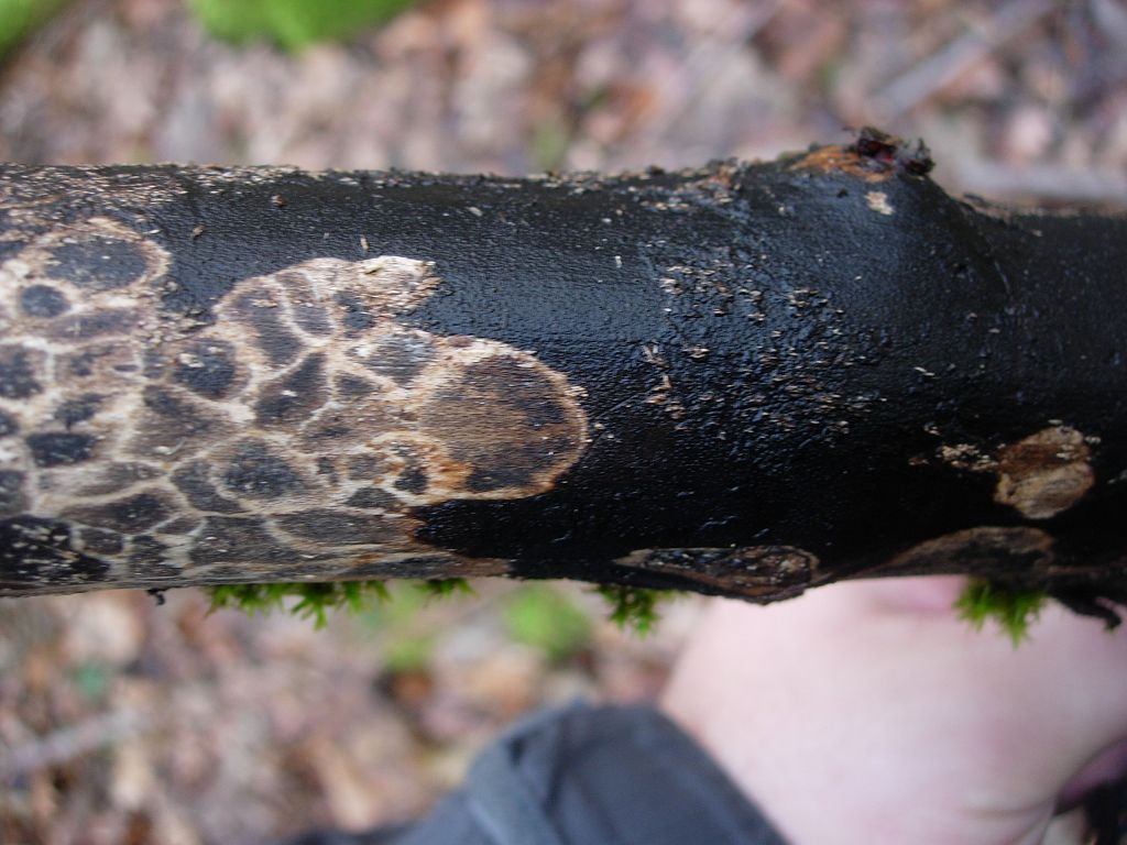Die einzelnen Schichten der Rinde waren faulig-feucht-weich in Auflösung begriffen, es hatten sich aber ganz unterschiedliche scharf mit schwarzen Linien umrissene Areale gebildet.