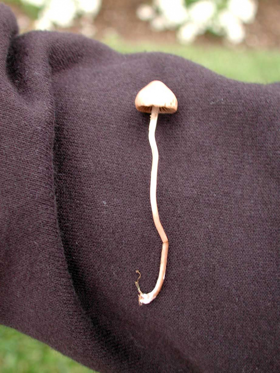 mir ist eingefallen, dass ich in kalifornien vor längerer zeit einen pilz in der wiese gefunden habe. sieht irgendwie verdächtig nach kahlkopf aus. aber vl liege ich weit daneben. diese kleinen wiesen-sorten sind nicht meine stärke