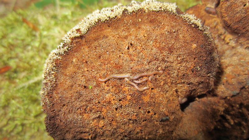 Kann ich momentan leider nicht sagen. Ich glaube, dass ich den Pilz gesehen habe ohne dass ich den Ast komplett umdrehen musste. Wie man aus den Bildern sieht, der Pilz wuchs auf der Rinde, und unter der Rinde waren die gezeigten Muster (Myzel-reste? Oder ist das Pilz selbst?).