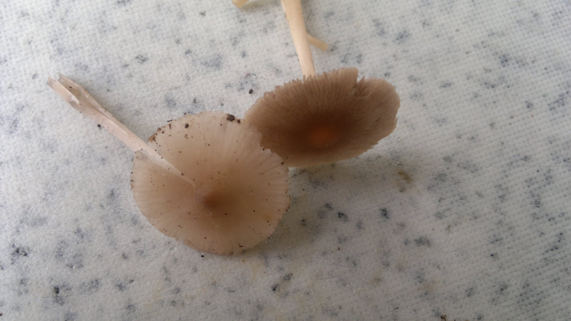 Das sind wohl zwei verschiedene Arten: Der mit den hellen Lamellen sollte ein Helmling sein, der andere ein Faserling, möglicherweise ist hier Psathyrella spadicogrisea nicht falsch.LG, Pablo.