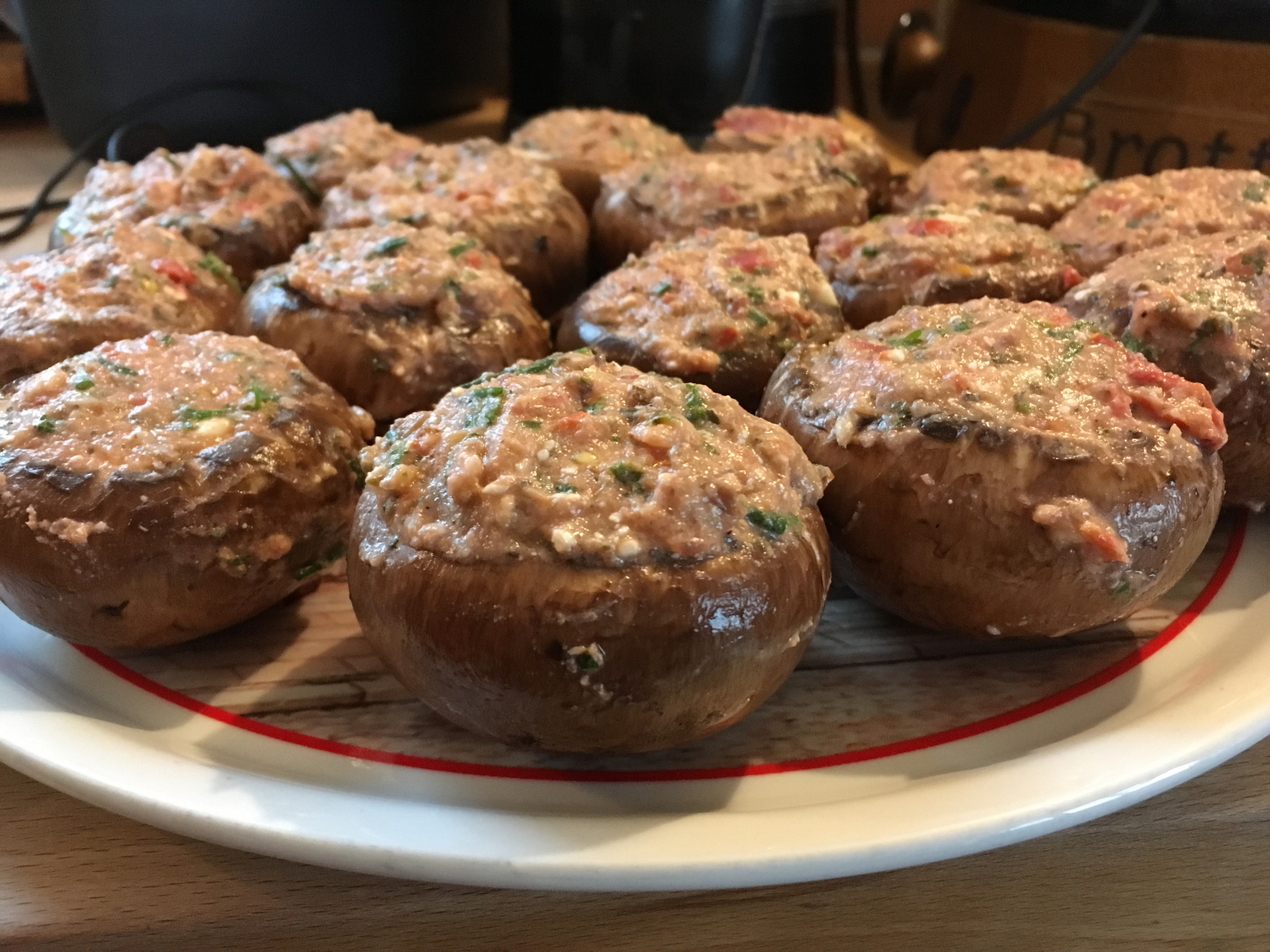 Stiele raus, mit Tomaten, Kräutern, Zwiebeln, Knobi, etwas Öl und z.B. Schafskäse mischen und pürieren und in die Hüte füllen. Da passen auch noch andere Dinge rein .... Das sieht dann in etwa so aus: