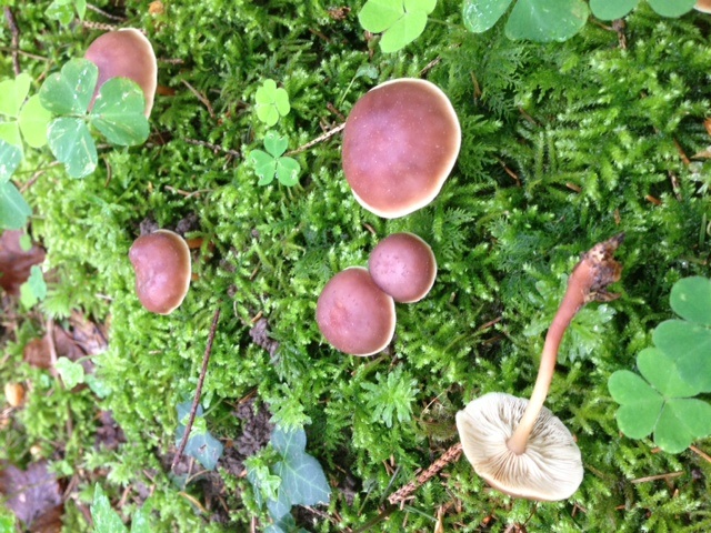 Dabei könnten die dunklen Hüte mit den hellen Rändern in die Richtung des Gelbblättrigen Blasssporrüblings (Gymnopus ocior) deuten.