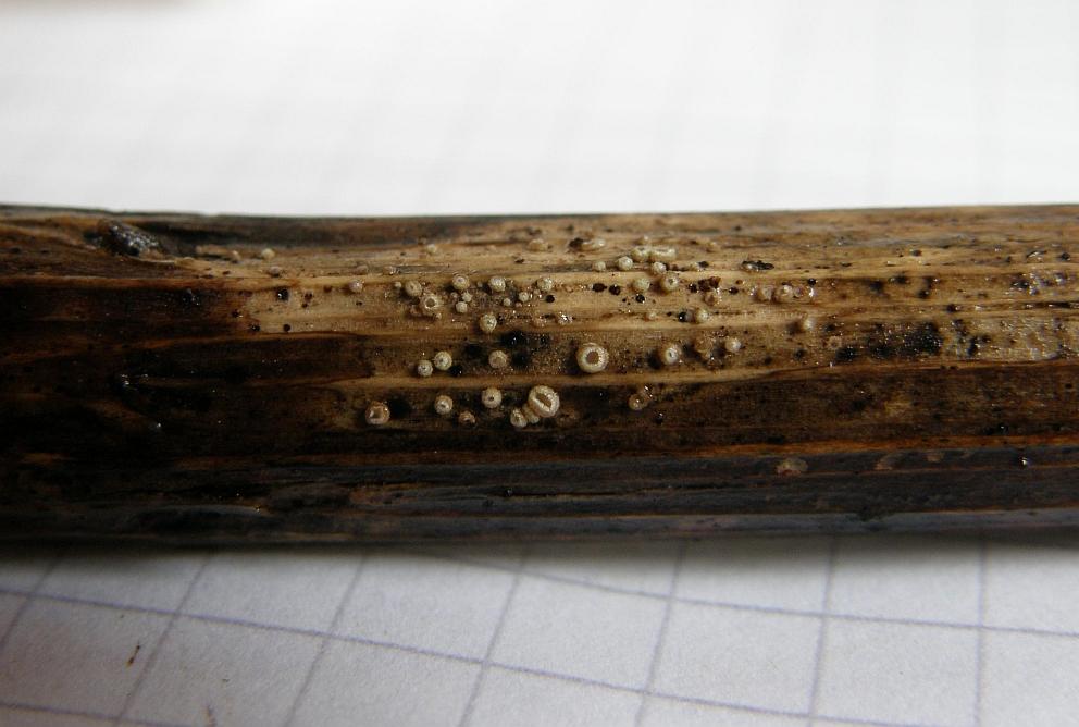 An solchen Stängeln kommt jetzt noch eine Gattung in den Einsatz, die ist noch unübersichtlicher als Mollisia. Nennt sich Pyrenopeziza.