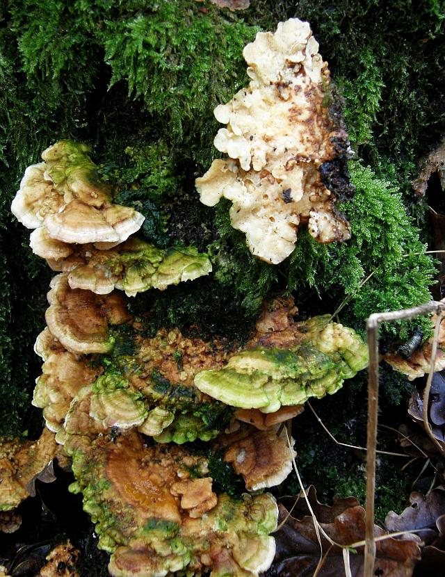Trametes ochracea im kleinen Kästchen, im großen Kästchen Panellus stipticus (Herber Zwergknäueling) und hinten auf dem Stumpf Trametes versicolor (Schmetterlingstramete)
