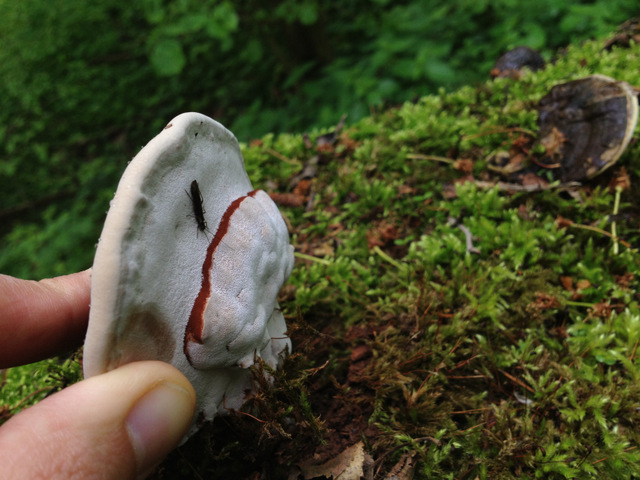 Der Pilz war sehr gummiartig und ließ sich von mir recht weit biegen, um für euch ein Bild von der Unterseite zu bekommen.Ich wollte ihn aber nicht abbrechen. Mir gefällt er, aber ich weiß nicht was es für einer ist. Ich vermute spontan einen Lackporling. Auffällig war, dass er sofort Druckstellen von meinen Fingern bekommen hat.
