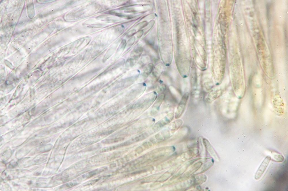 Auffällig ist die schwarzlackierte Blatt-Epidermis des Substrates dort, wo sich der Becher zunächst schiffchenförmig durch die Blattzellen schiebt.