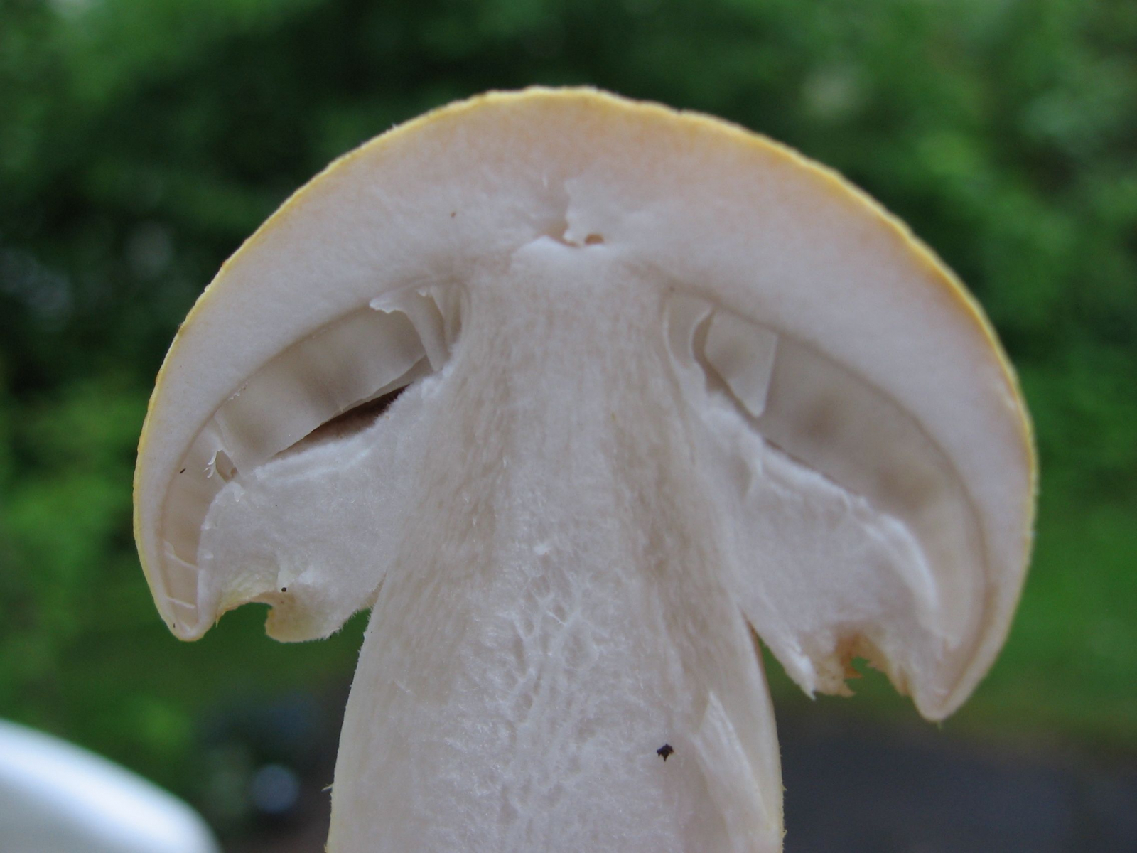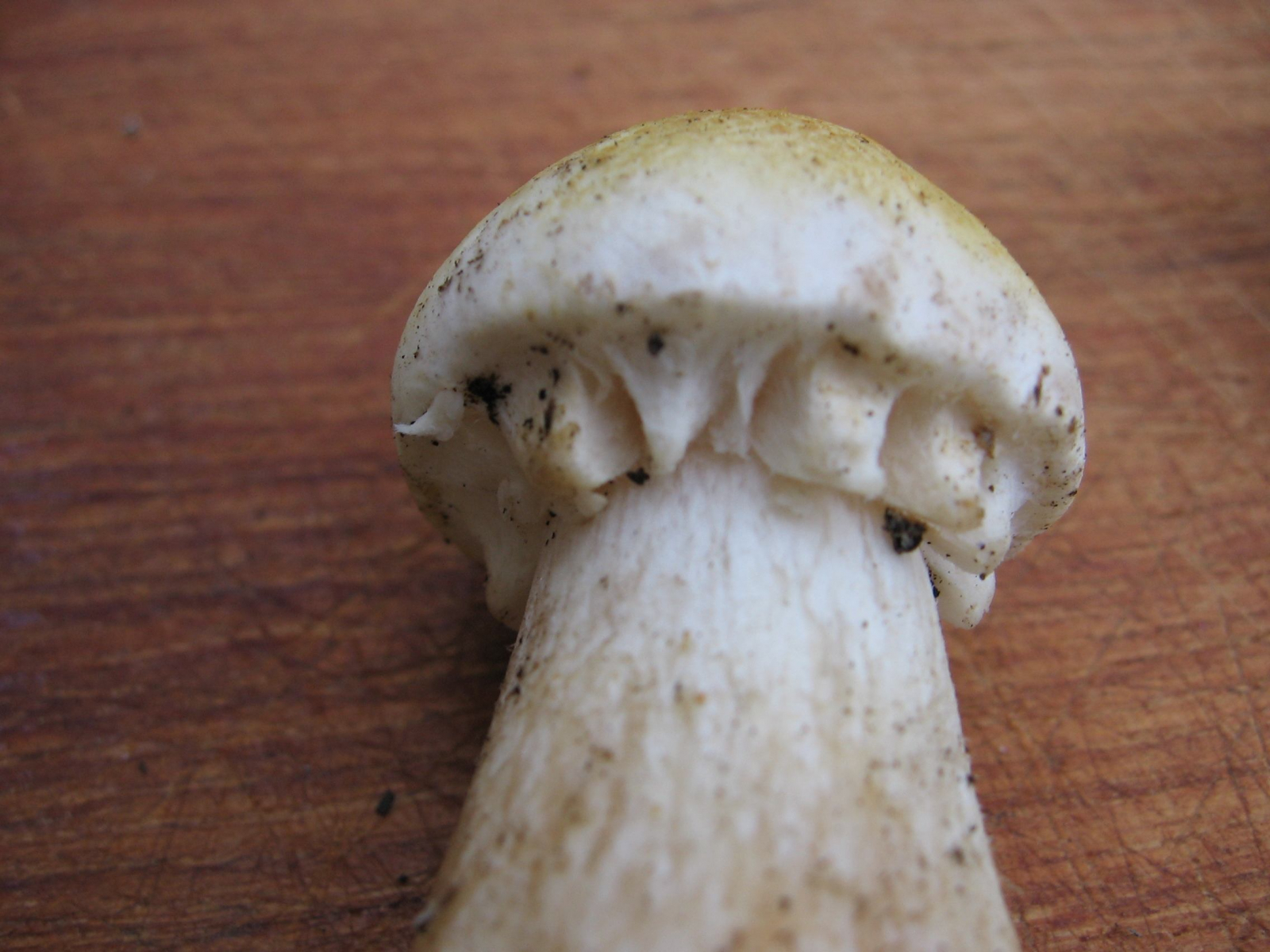 Wenn du nun aber zu der Art nachliest, wirst du eventuell über ein paar andere Pilze stolpern, zB Agaricus macrocarpus (großer Anis - Egerling), Agaricus leucotrichus (wird dieser hier nicht sein) oder Agaricus fissuratus (Rissigschuppiger Egerling, nicht vom Namen irritieren lassen). Also wenn man aus A. arvensis keine Sammelart machen will, ist die Abgrenzung nicht immer ganz einfach. Allerdings muss man auch nicht immer alles ganz genau nehmen, wenn man nicht mag.