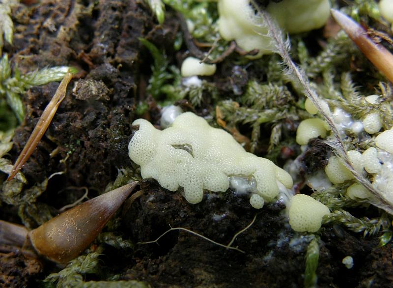 Ceratiomyxa fruticulosa var. poroides finde ich sehr gut, denn einen Tag vorher (auch im oben verlinkten Bericht) hatten wir auch schon Ceratiomyxa fruticulosa (var fruticulosa?) gefunden. Das sah dann so aus: