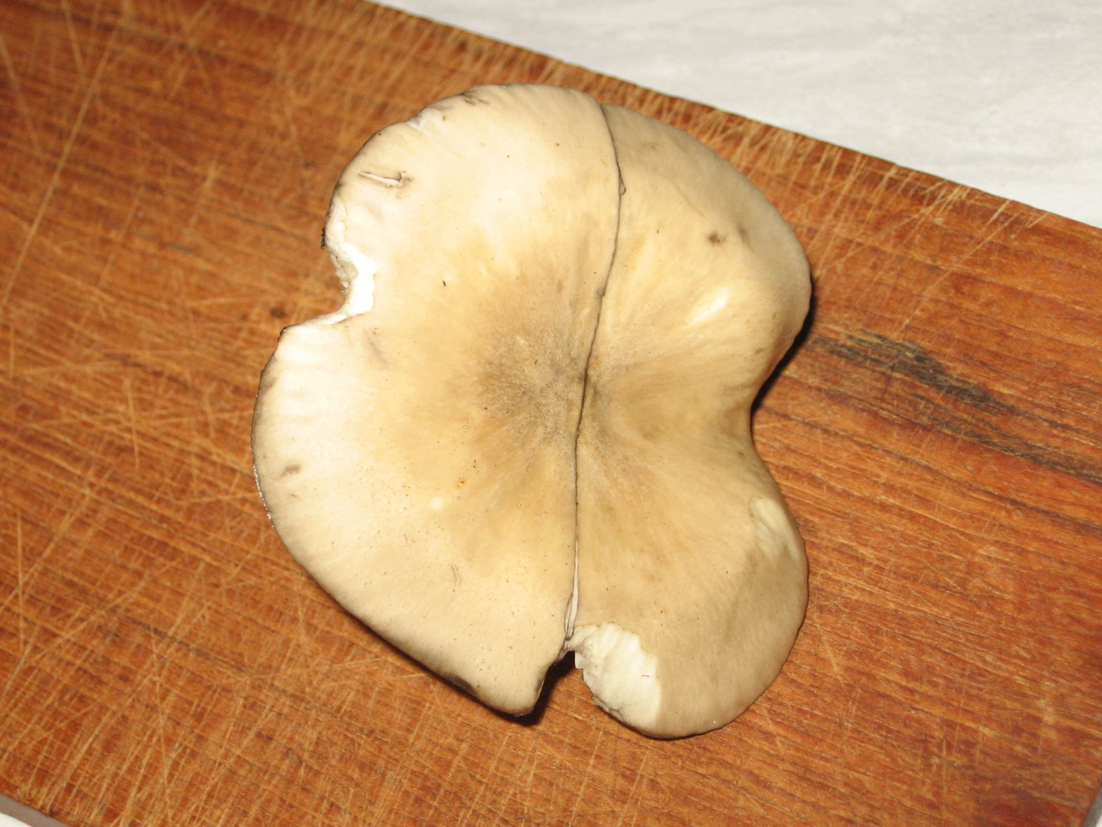jetzt ist schon Juni, und immer noch suche ich nach dem Maipilz. Heute dachte ich, ich hätte endlich welche gefunden, am Rande eines kleinen Laubwäldchens in der Wiese, angrenzend an den Rasen eines Gewerbegeländes (20 Meter weiter wachsen Netzstielige Hexenröhrlinge, aber jetzt noch nicht), 4-5 Stück in einem kleinen Ring. Geruch: Eindeutig Gurke, hätte nie gedacht, daß ein Pilz so riechen kann. Ganz happy nahm ich einen mit, schnitt ihn daheim in der Mitte durch für die Bilder, las mich erst mal erneut durch diverse Maipilz-Beiträge hier - und dann war nach ca. einer Stunde doch tatsächlich der Pilz an manchen Stellen verfärbt: Die Lamellen, die ich ursprünglich mit dem Finger überstrichen hatte zwecks Beschaffenheitsprobe, waren an diesen Stellen braun, der Hutrand war braun angelaufen und die Schnittfläche auch. Der ganze Pilz ist auch nachgedunkelt. Und der Hutrand ist schwach radial gerieft (huch!).