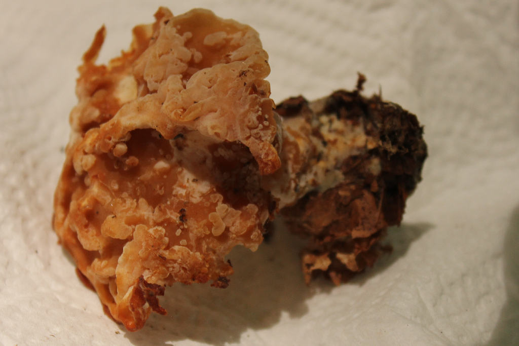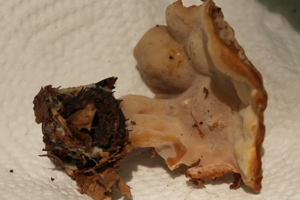Der Fruchtkörper saß jedenfalls im Boden fest auf einer vergrabenen Buchenfruchthülse auf (Bilder), bzw. entspringt direkt aus dieser. Neben dieser waren weißliche Myzelstränge im Boden zu erkennen. Der Pilz ist ca. 3-4 cm im Durchmesser und mit Buchenfruchthüllse ca. 4 cm hoch. Er scheint in eine Art Hut und Stielbereich unterteilt zu sein, letzterer ist klar exzentrisch und der Hut nur auf einer Seite ausgeprägt.
