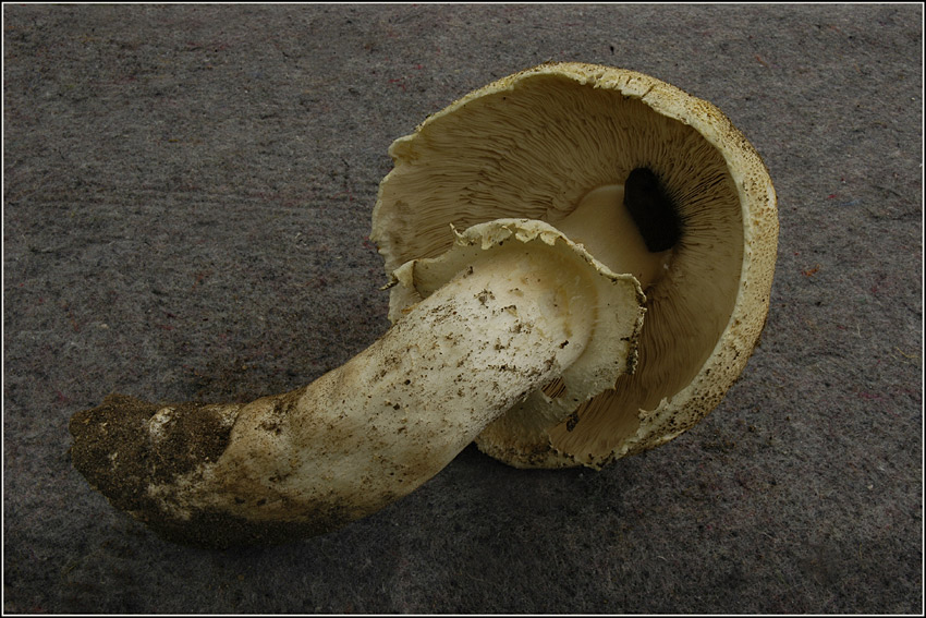 Er sieht irgendwie einem Champignon ähnlich...? Allerdings bei chremfarbener Lamellenstruktur. Bei der Größe müßte doch schon eine rosa oder rötliche Farbe erkennbar sein.Der Geruch war angenehm und der Anschnitt in der Stielbasis zeigte eine leichte Braunverfärbung.