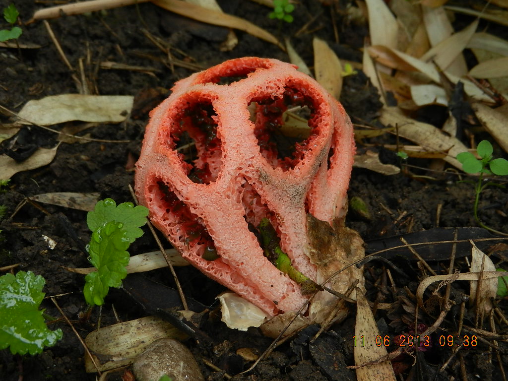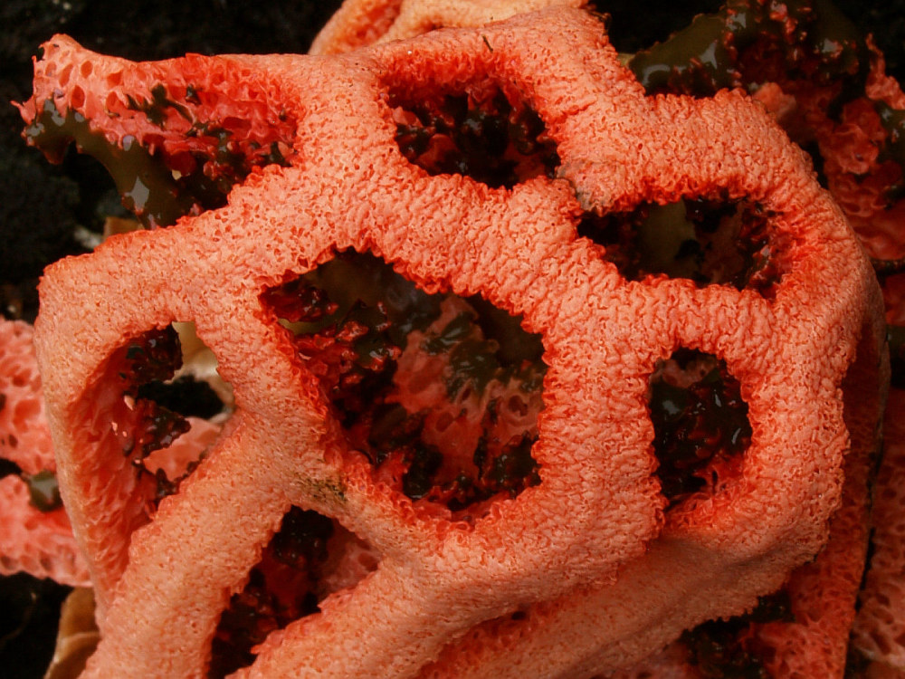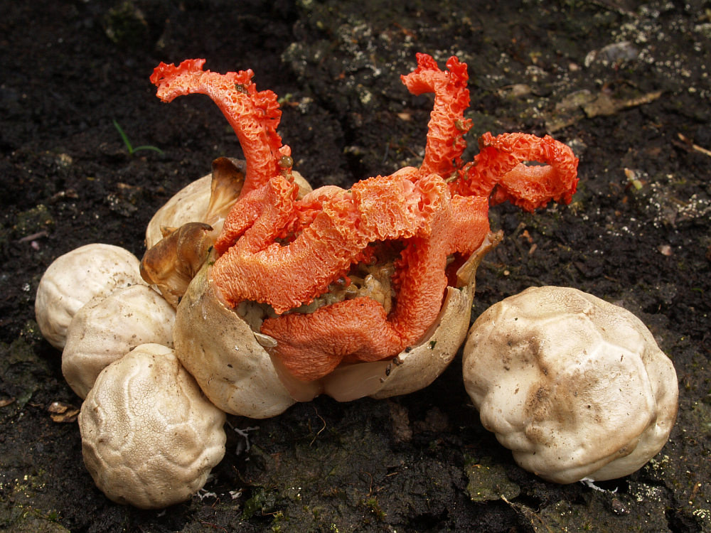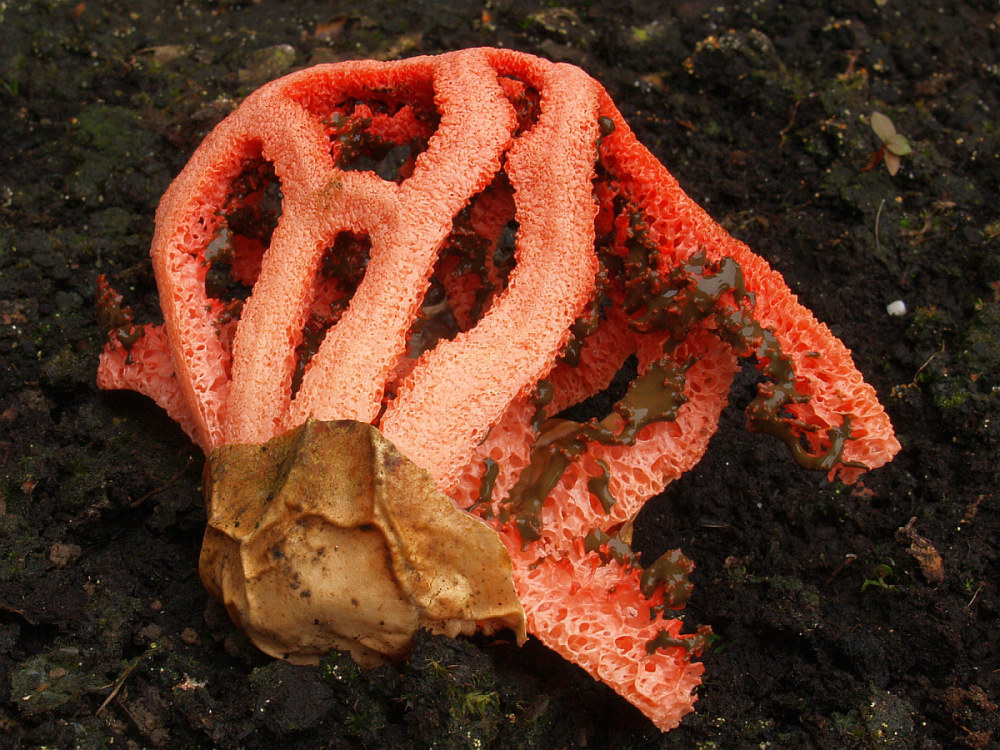 Aus einem Hexenei von 2 - 3 cm Durchmesser, mit reichlich weißlichen Rhizomorphen an der Unterseite und schmutzig weißer Exoperidie entwickelt sich nach oberseitigem Aufreißen der letzteren durch Streckung ein freudig erdbeer- bis himbeerrot gefärbtes, schwammig-poröses, gitter- bzw. netzartiges, glühbirnenförmiges Rezeptakulum, welches bis 10 cm hoch werden kann. Auf der Innenseite des Rezeptakulums befindet sich die dunkel-olivgraue, schleimig-schmierige, widerlich nach Katzendreck riechende Gleba, mittels der sporenverbreitende Insekten, z. B. Schmeißfliegen, angelockt werden sollen. Die Exoperidie bleibt nach dem Aufreißen am Grund des Fruchtkörpers, manchmal auch als lappiger Rest auf dem Rezeptakulum erhalten. Während das Hexenei einige Wochen im unreifem Zustand an der Bodenoberfläche überdauern kann, erfolgt das Aufreißen der Exoperidie, die Streckung des Rezeptakulums und das Vergehen des Fruchtkörpers innerhalb eines bis zweier Tage.