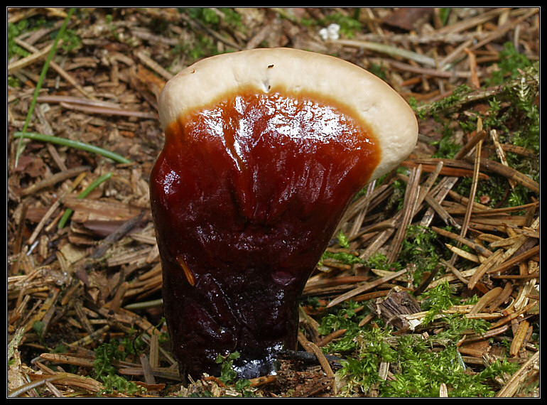 hier mal ein ganz junger G. carnosum. Er wird im nu dunkel-weinrot und ist kaum mit G. lucidum zu verwechseln.