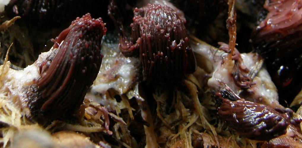 Am letzten Freitag auf der >Tour mit NiLa, Markus und Peter< begegnete uns ein hübscher und ganz schön großer Stelzenschleimpilz. Die einzelnen Fruchtkörper in den Büscheln sind mit Stiel sicher mehr als 15 mm lang.